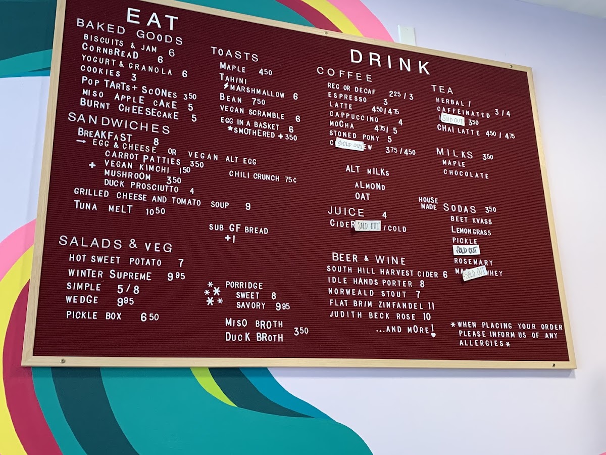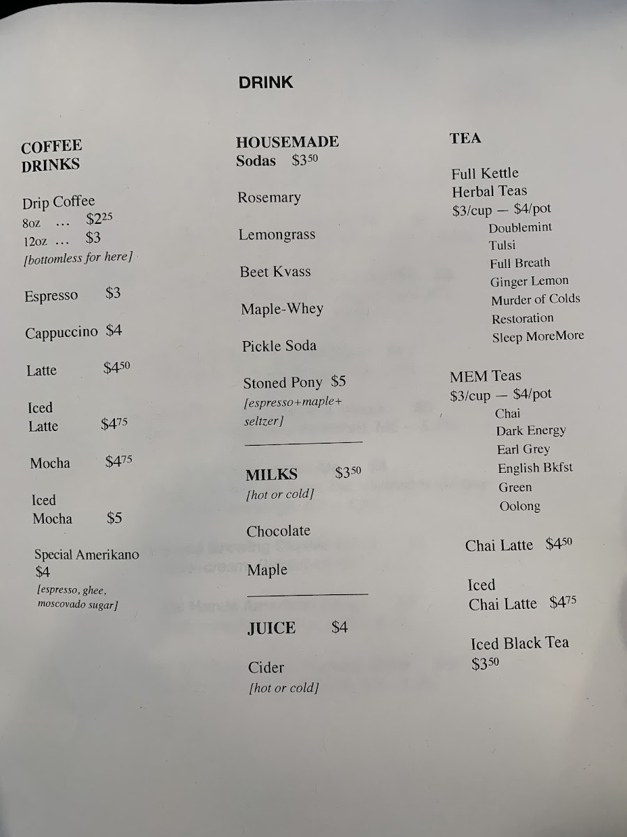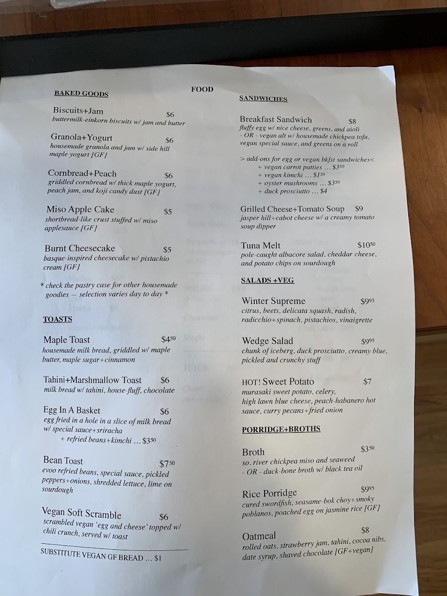 Overall, The Upper Bend’s menu feels thoughtfully curated, balancing comforting staples with creative twists across each category. The baked offerings like Biscuits+Jam, Granola+Yogurt, Cornbread+PeachMiso Apple Cake, and Burnt Cheesecake set a warm, inviting tone, while the toast selection-especially Maple Toast and Tahini+Marshmallow Toast-adds a playful, modern edge. Heartier options such as the Breakfast Sandwich, Grilled Cheese+Tomato Soup, and Tuna Melt deliver familiar satisfaction, complemented by lighter, vegetable-forward dishes like Winter Supreme, Wedge Salad, and Hot! Sweet Potato. The comforting simplicity of Broth, Rice Porridge, and Oatmeal rounds out the savory side, while beverages-from classic Espresso, Latte, and Cappuccino to inventive housemade sodas like Rosemary and Pickle Soda-provide plenty of variety. Even without listed prices, the menu’s diversity and creativity leave a strong impression, suggesting a spot that values both quality and originality in equal measure.